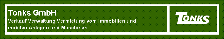 Die Tonks betreibt den Kauf und Verkauf, das Halten und Verwalten von Immobilien. Außerdem verwalten wir Ihren Maschinen- und Anlagenpark, betreuen die Vermietung der Maschinen und kaufen und verkaufen Maschinen und Anlagen. Wartung und Servicedienstleistungen gehören ebenfalls zu unseren Kernbereichen.